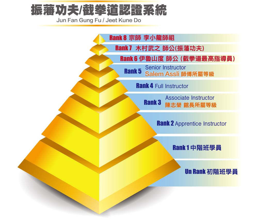 在李小龍師祖過世之後,「Jun Fan Gung Fu / Jeet Kune Do」的認證系統就區分為Unrank~Rank8。李小龍師祖為最高階段的Rank8,木村武之(Taky Kimura,李小龍師祖的親傳弟子,以下稱木村師公)為Rank7,伊魯山度師公為Rank6。而在伊魯山度師公的學生當中(木村師公沒有再進行指導員認定),有些人曾經被李小龍師祖親自指導過,又在伊魯山度武術學院裡持續修練,伊魯山度師公在這些人裡挑選出少數幾位授與其Rank5(Senior Instructor)的認證,再從其餘的人之中挑出幾位授予Rank4(Full Instructor )認證,接下來就是Rank3(Associate Instructor)、Rank2 (Apprentice Instructor/高階班學員)、Rank1(中階班學員)、Un Rank(初階班學員),已李小龍師祖為頂點而設立出一個金字塔造型的認證系統。