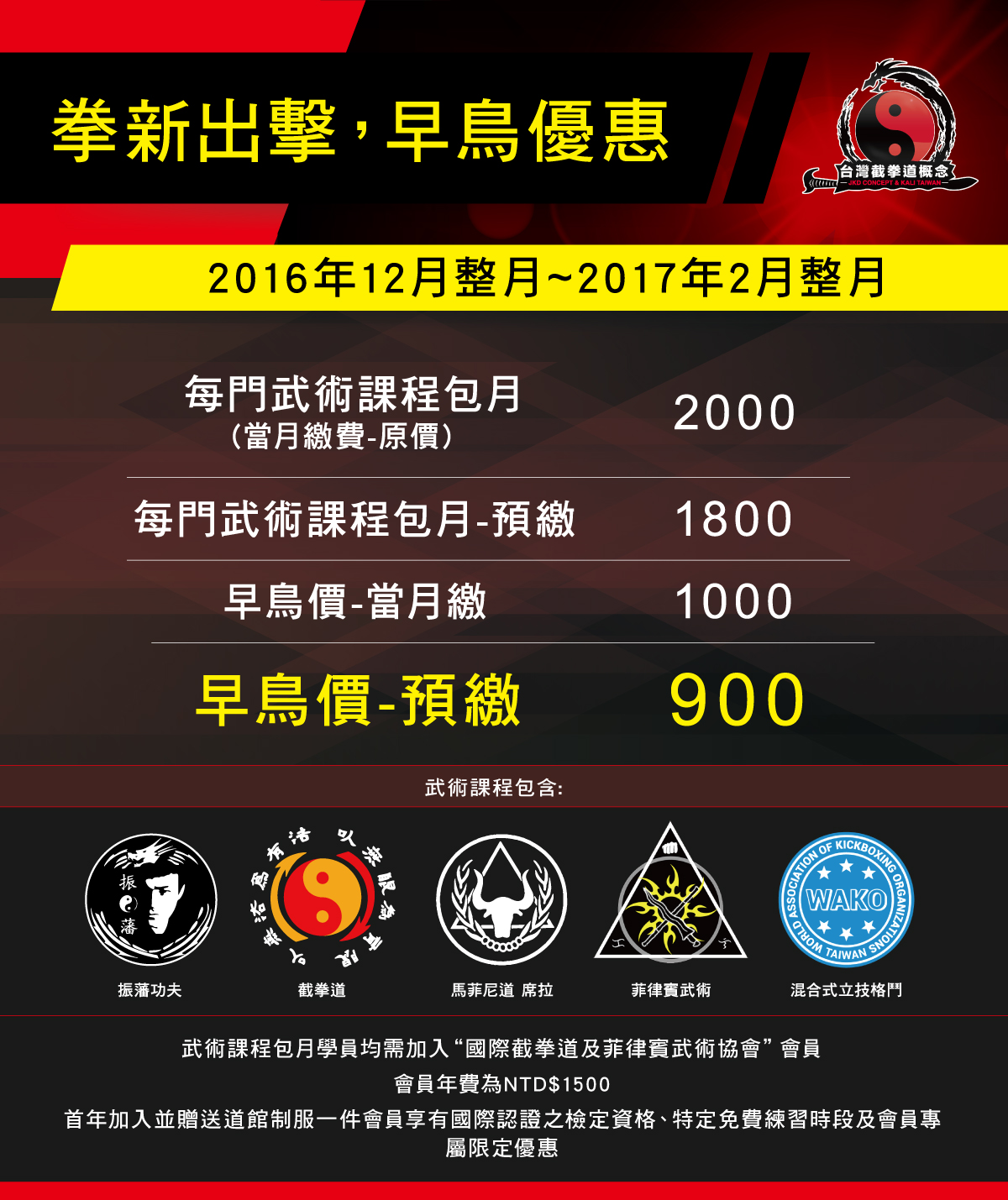 註:武術課程包月學員均需加入“國際截拳道及菲律賓武術協會”會員,
